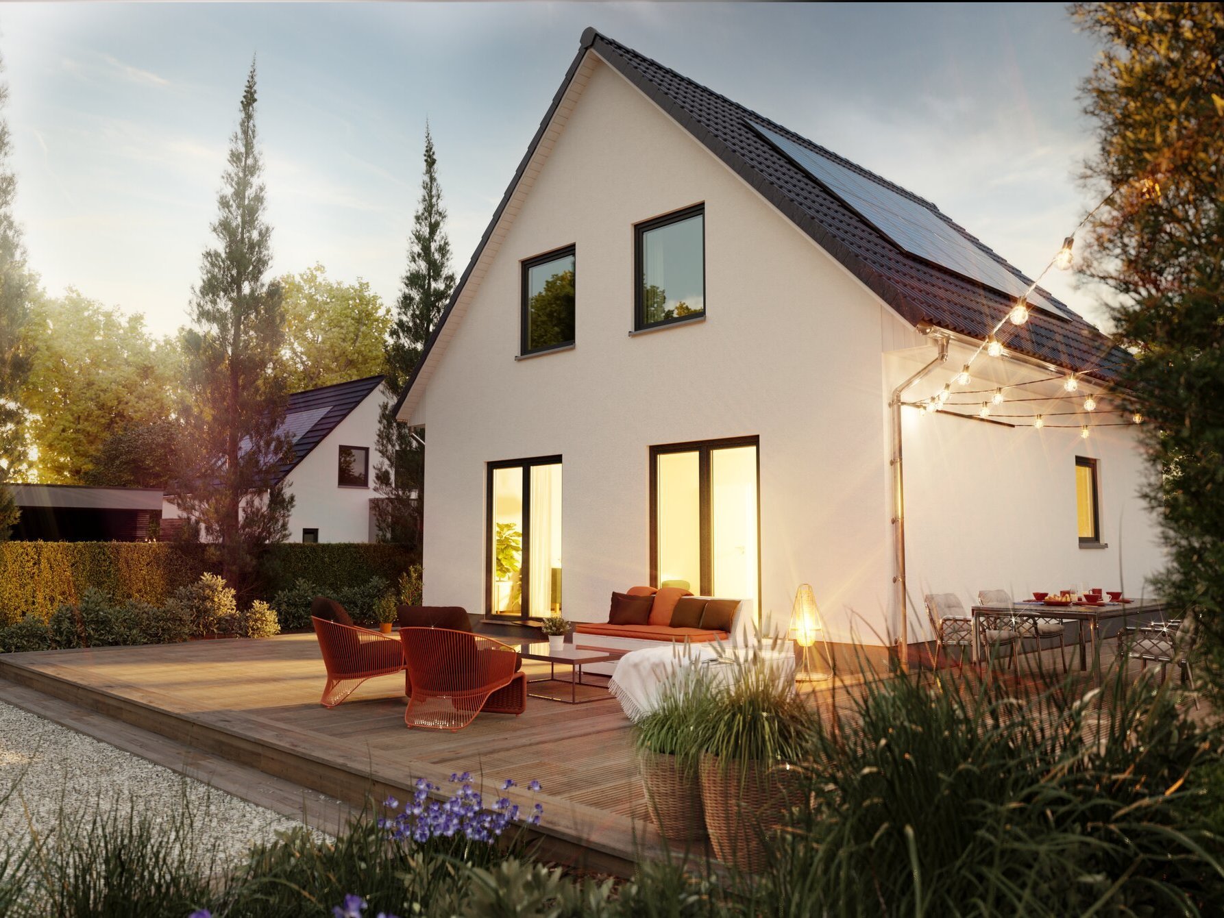 Diese Kriterien sind teilweise noch genauer spezifiziert. Was die Dachvorgaben für das Fertighaus betrifft, gibt es Auflagen zur Dachneigung (DN), zum vorgesehenen Material sowie zur Ausrichtung des Dachfirsts.