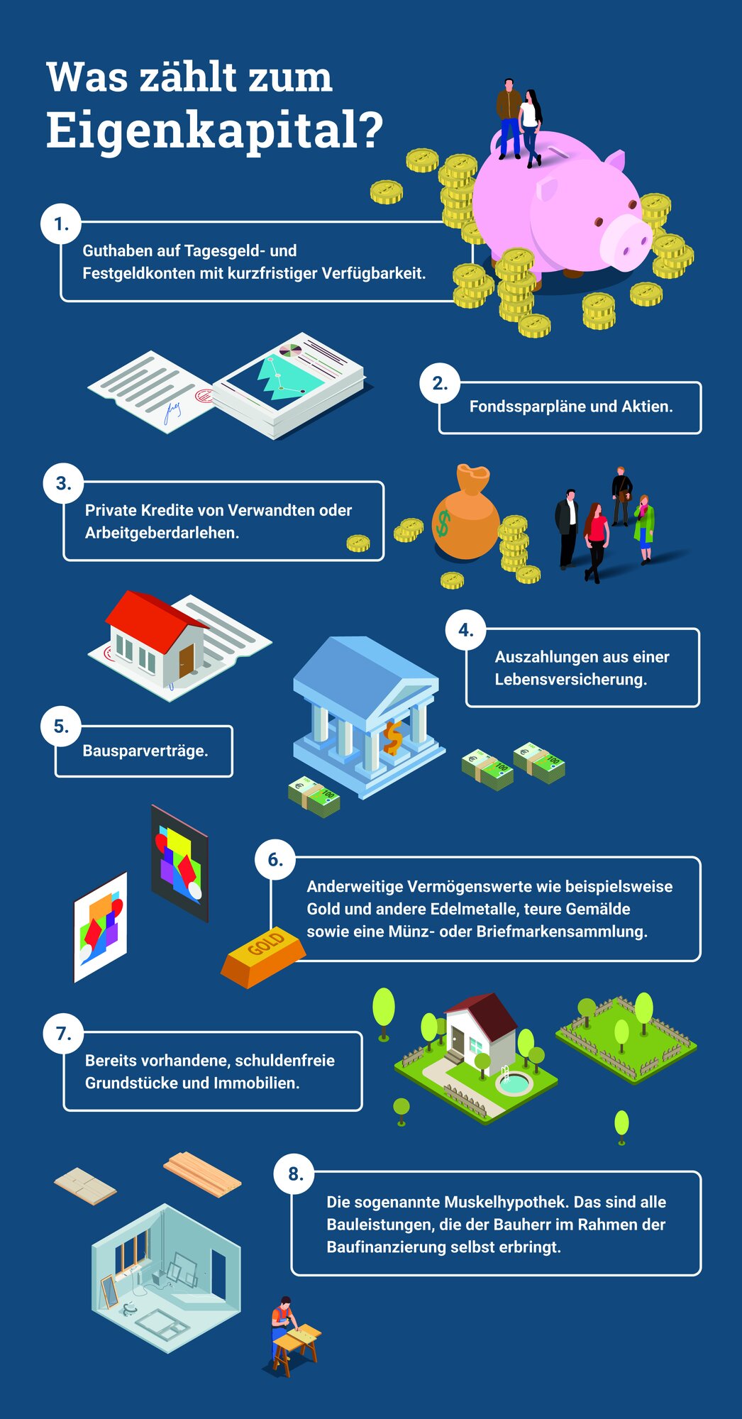 In der Regel sind unter Eigenkapital Ersparnisse zu verstehen. Aber auch Bausparverträge werden unter anderem als Eigenkapital angesehen. Welche Werte Ihre Bank als Eigenkapital betrachtet, sehen Sie hier.