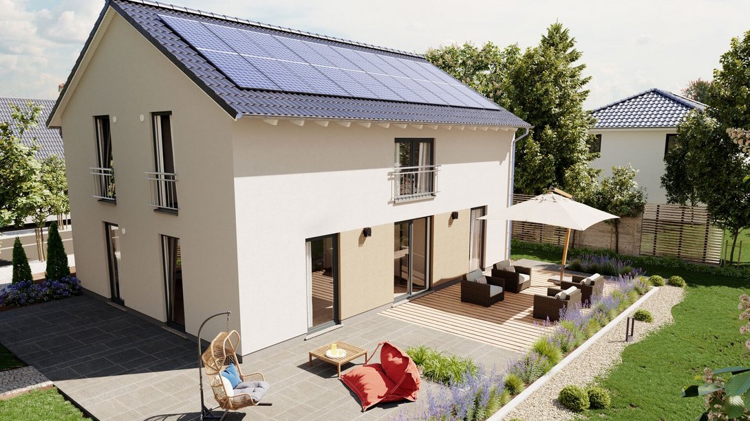 Das Landhaus 142 modern hat die gleiche Höhe. Durch eine geänderte Dachform hat die obere Etage gerade Außenwände. Im Erdgeschoss sind alle Fenster bis zum Boden verlängert. Das ermöglicht eine umseitige Zugänglichkeit. Außerdem wird so die Aussicht und die Nutzung von Sonnenlicht optimiert. Das Landhaus 142 modern eignet sich ebenfalls optimal für Neubaugebiete mit niedrigen Grundstückspreisen.