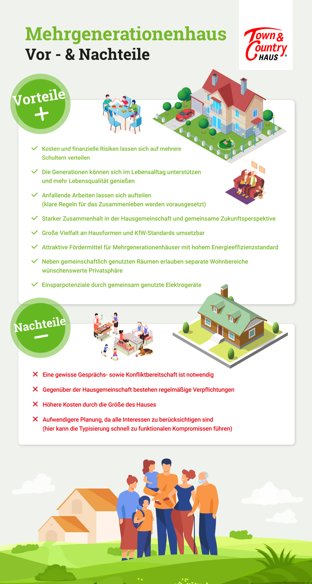 Hier stellen wir Ihnen die wichtigsten Vor- und Nachteile vor, falls Sie Ihre Pläne vom Bau eines Mehrgenerationenhauses konkretisieren möchten. Sie sollten die Vorteile und Nachteile für sich gewichten: Was für den beiden ein Ausschlusskriterium ist, stellt für den anderen vielleicht sogar einen gewissen Reiz dar. Zudem ist es wichtig, die Vor- und Nachteile mit der zukünftigen Gemeinschaft des Mehrgenerationenhauses zu besprechen. Bei der Bewertung von Vor- und Nachteilen sollten die Meinungen nicht auseinandergehen. Andernfalls sind Konflikte für das spätere Leben im Mehrgenerationenhaus vorprogrammiert.