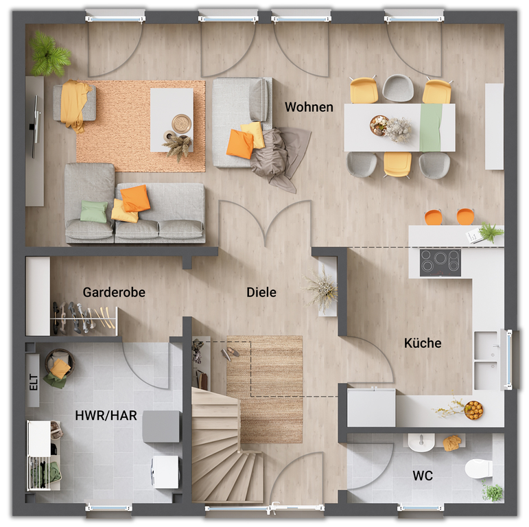 Dieses Massivhaus ist ein ideales Zuhause für die ganze Familie. Dank seiner Flexibilität bietet unser Stadthaus individuelle Räume für jede Lebenslage, ob ein zusätzliches Kinderzimmer, ein geräumiges Home-Office oder ein Gästezimmer für die Großeltern oder Freunde. Hier fühlen sich groß und klein willkommen.
