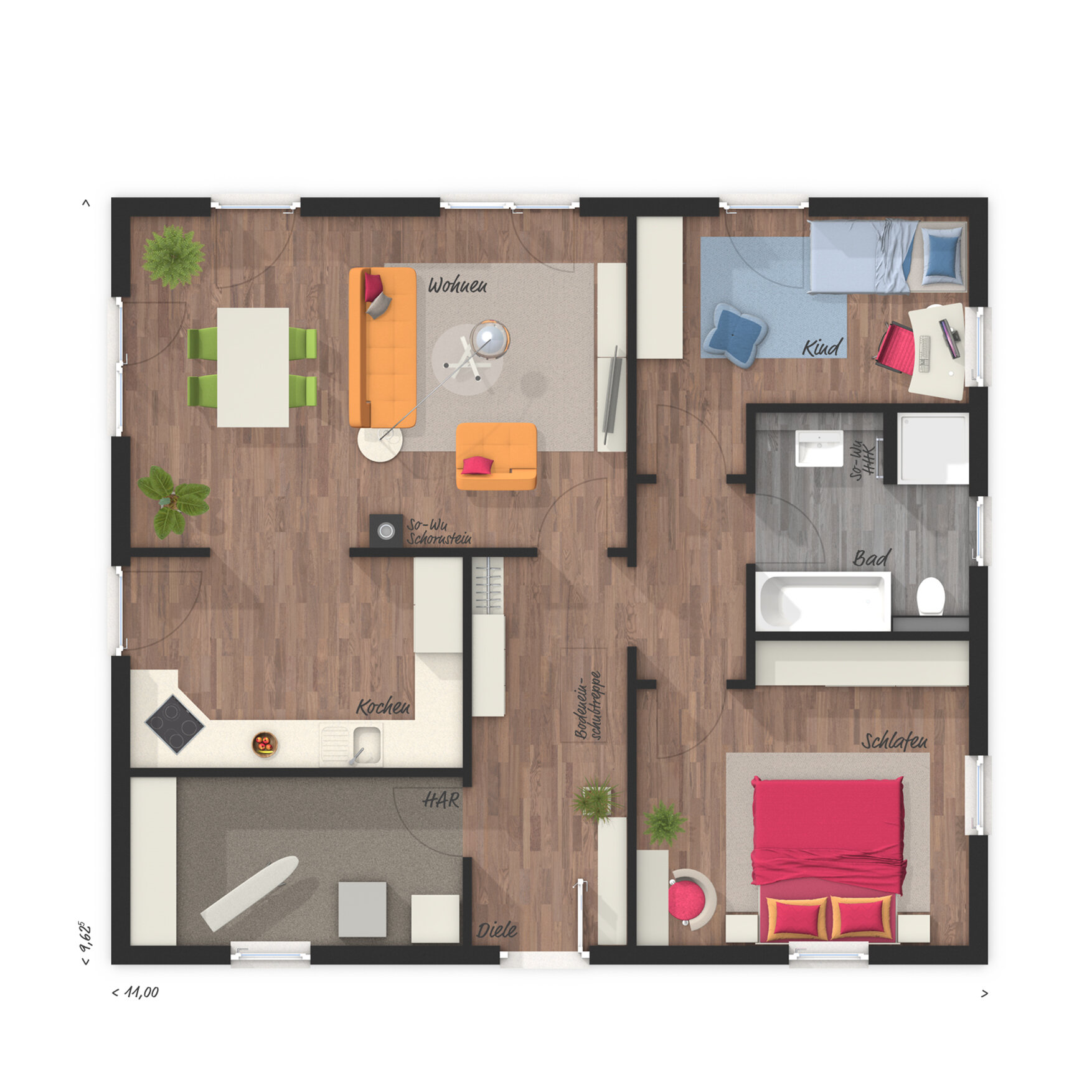 Auf rund 92 Quadratmetern können Bauherren Ihren Familienalltag dank cleverer Planung im lichtdurchfluteten Wohnzimmer mit Essbereich genießen. Das Wohnzimmer bietet direkten Zugang zum Garten und zur offenen Küche, die zum gemeinsamen Kochen einlädt. Das großzügige Schlafzimmer lässt Sie in die Welt der Träume entfliehen, während Sie sich Ruhe und Entspannung gönnen. Ob Büro, Gäste- oder Kinderzimmer – im Bungalow 92 können Sie als Familie Ihr Zuhause einrichten. Damit erfüllt sich der Wunsch nach einem barrierearmen Traumhaus für jetzt und später.