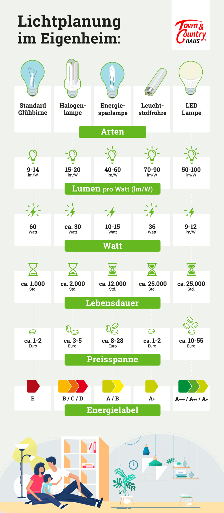 Mittlerweile gibt es in Deutschland mehr als 150 verschiedene Leuchtmittel-Typen, welche sich in zwei Hauptklassen unterteilen lassen: Festkörperlampen und Entladungslampen. Zu ersterem zählt zum Beispiel die Glühlampe. Sie gilt mit ihrem warmweißen Licht als Wärmespender und gibt Farben realitätsgetreu wieder.