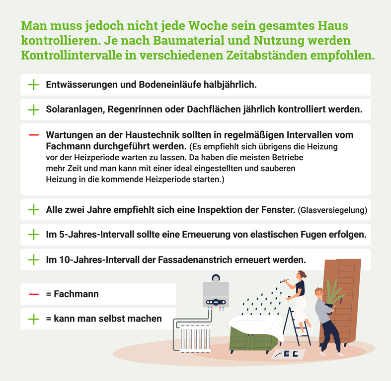 Regelmäßige Sichtkontrollen zum Einschätzen des Gebäudezustands müssen nicht zwangsläufig vom Fachmann vorgenommen werden. Zwar sollten Wartungen an elektrischen Geräten, Lüftungen oder Heizungen einem Experten überlassen werden, dennoch können auch Town & Country Bauherren laut dem Prüf- und Wartungsplan in der Hausakte kleinere Sichtkontrollen selbst durchführen. So werden kleine Mängel schneller festgestellt und durch eine zügige Reparatur verhindert, dass ein größerer Schaden entsteht, welcher einen teureren Sanierungsaufwand notwendig macht.