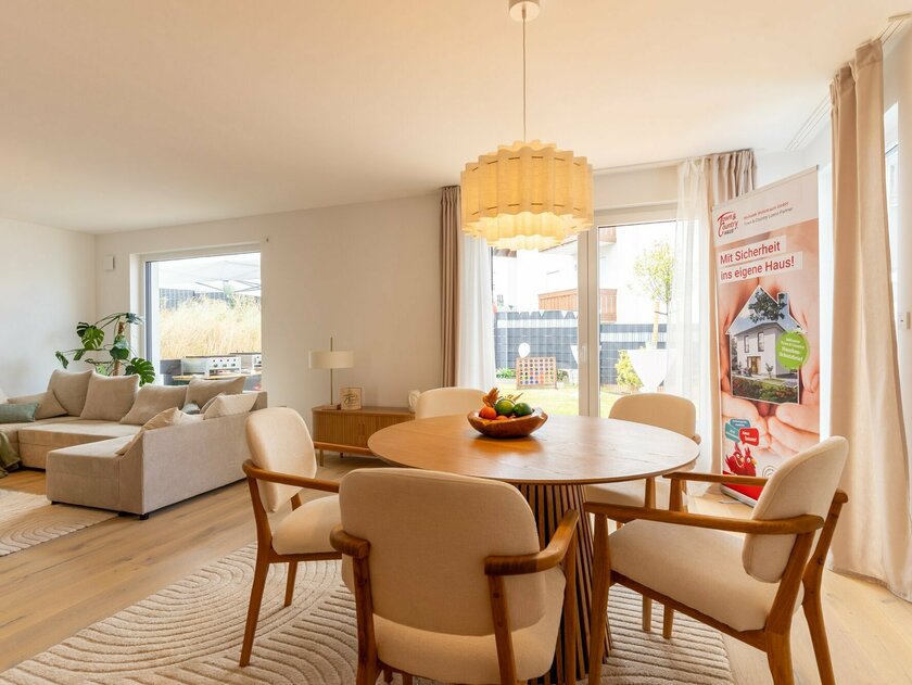 Ein echtes Highlight sind die Fensterflächen, die dem Haus seine besondere Ausstrahlung verleihen: Vom gemütlichen Lesefenster über elegante dreiteilige Trendfenster bis hin zu großzügigen Glasfronten zeigt dieses Musterhaus die gesamte Vielfalt moderner Gestaltung. Das Ergebnis ist eine unvergleichliche Wohnatmosphäre, die Offenheit und Geborgenheit perfekt verbindet.